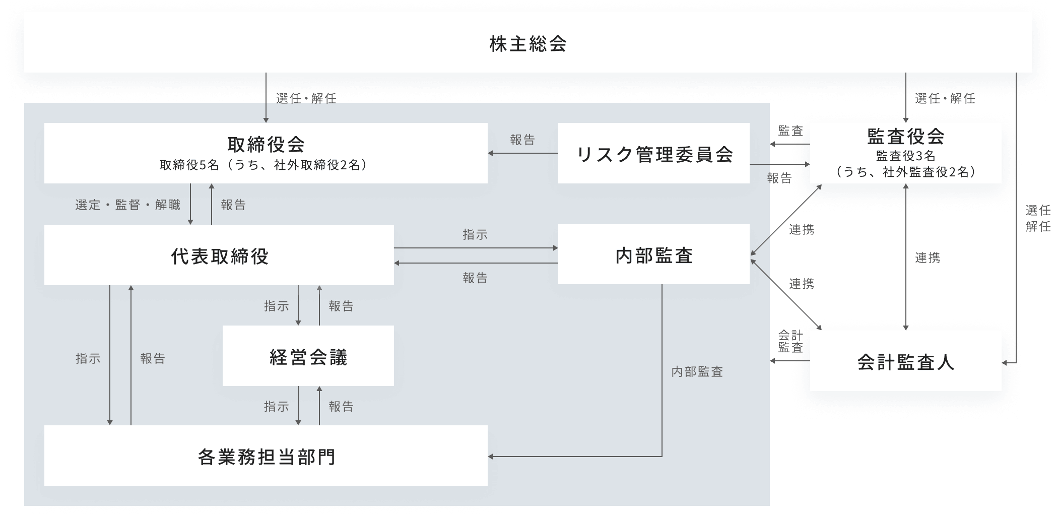 当社の取締役会は、取締役5名(うち社外取締役2名)で構成されています。毎月1回の定時取締役会の他、必要に応じて臨時取締役会を開催し、重要事項の意思決定を行うとともに、取締役の職務執行を監督しています。